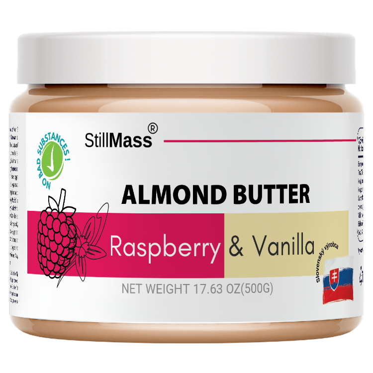 Složení příchuť vanilka/malina: 100% mandlová pasta, maliny lyofilizované v prášku, strouhaná vanilka, sladidlo: glykosidy steviolu.