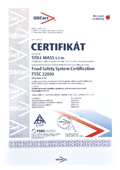Sme držiteľom Certifikátu systému bezpečnosti potravín FSSC 22000 - Food Safety System Certification FSSC 22000